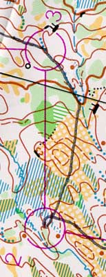 aimed for the trail junction, then into the open toward the two knolls. control was